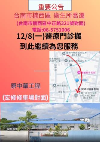 因地震造成楠西區衛生所房屋受損,衛生所在12/8星期一搬到宏修修車場對面的組合屋繼續為大家服務,若有問題可來電詢問06-5751006。